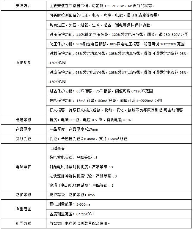 用于對用電線路的關鍵電氣因素,如電壓、電流、功率、溫度、漏電、打火、能耗等進行實時監測,具有預警報警、電能計量統計、故障定位等功能。
