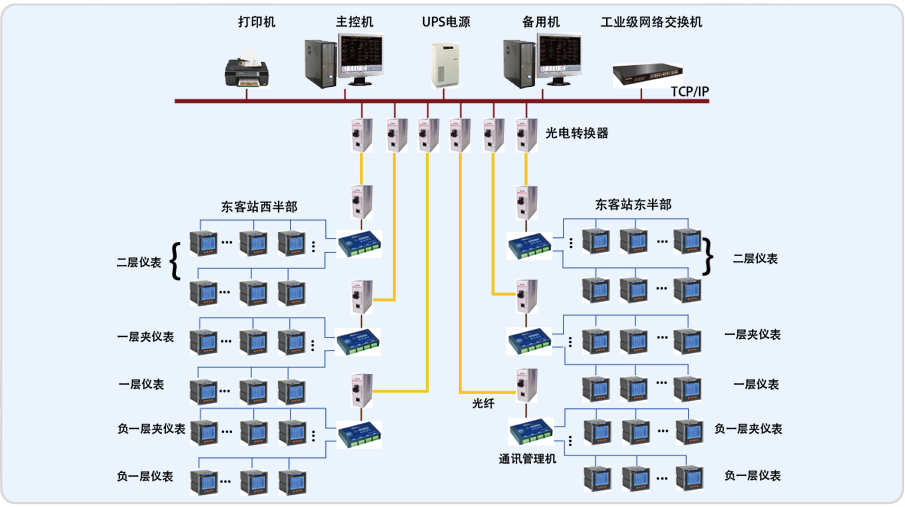 成都東客站電能管理系統(tǒng)采用雙機(jī)服務(wù),位于東客站一層西南角值班中心,同時(shí)該系統(tǒng)配有6臺(tái)管理機(jī),根據(jù)現(xiàn)場儀表的分布范圍,合理的分配6臺(tái)管理機(jī)的管理范圍;為保障數(shù)據(jù)傳輸?shù)膶?shí)時(shí)性和穩(wěn)定性,均采用光纖進(jìn)行數(shù)據(jù)上傳。在值班室對(duì)管理機(jī)上傳的數(shù)據(jù)進(jìn)行多樣式表現(xiàn)方式,畫面比較形象直觀;系統(tǒng)同時(shí)具備向BA系統(tǒng)轉(zhuǎn)發(fā)數(shù)據(jù)的功能。