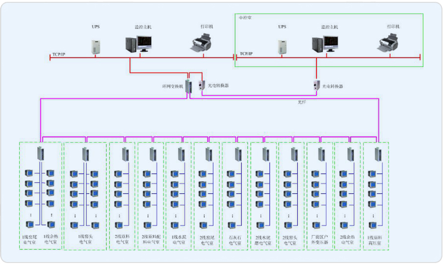中材萍鄉(xiāng)水泥有限公司廠區(qū)重點(diǎn)用電回路分別分布于1線原料高壓室、1線窯尾電氣室、1線窯頭電器室、2線原料電器室、2線原料配料電氣室、1線水泥電氣室、2線窯尾電氣室、石灰石電氣室、2線水泥磨電氣室、2線窯頭電氣室、廠前區(qū)戶外變壓器、1線余熱電氣室以及2線余熱電氣室等共計13個電器室內(nèi)。