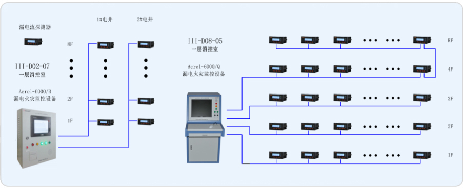 三湘廣場由III-D02-07地塊和III-D08-05地塊各自一獨棟商業(yè)建筑組成。為了確保本地塊的樓宇的電氣安全,現(xiàn)在樓層內(nèi)的配電箱進線端安裝安科瑞品牌ARCM系列漏電流探測器,由此來實時監(jiān)測變電所內(nèi)重要回路的漏電流,并在III-D02-07地塊和III-D08-05地塊消控室內(nèi)安裝ACREL-6000電氣火災(zāi)監(jiān)控設(shè)備,以確保變電所配電系統(tǒng)的電氣安全。