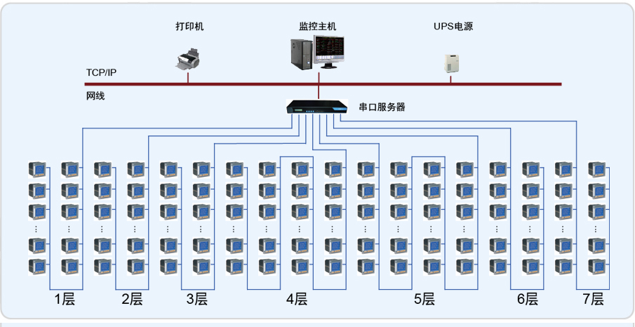 本項目電力監(jiān)控系統(tǒng)采用分布式結(jié)構(gòu),為現(xiàn)場層、通訊層和后臺監(jiān)控層。現(xiàn)場層指分布于于各樓層動力箱及地下配電室內(nèi)的安科瑞系列儀表,通訊層包括NPORT5630-16串口服務(wù)器、網(wǎng)絡(luò)交換機等,后臺監(jiān)控層包括計算機、打印 機、UPS電源等。通訊層及后臺監(jiān)控層都位于地下監(jiān)控室內(nèi)。現(xiàn)場所有安科瑞系列儀表通過屏蔽雙絞線拉到地下監(jiān)控室內(nèi),與串口服務(wù)器相連,經(jīng)交換機與計算機連接,實現(xiàn)數(shù)據(jù)采集。