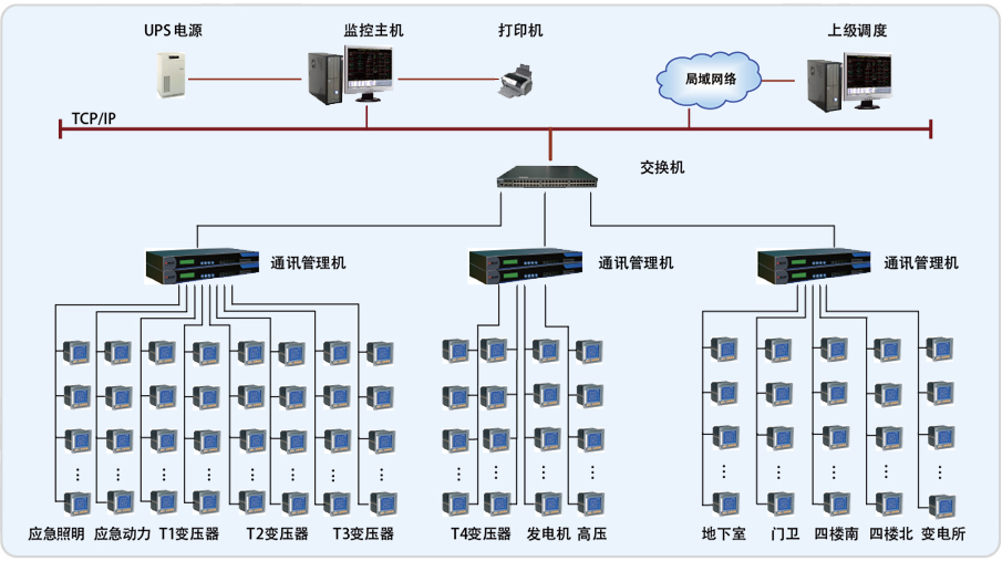 本監(jiān)控系統(tǒng)主要實(shí)現(xiàn)對月亮灣集中供冷中心的20/0.4kV配電系統(tǒng)進(jìn)行監(jiān) 控;監(jiān)控范圍為變電所的T1、T2、T3、T4變壓器進(jìn)線柜、聯(lián)絡(luò)柜、應(yīng)急照明配電屏1/2、應(yīng)急動(dòng)力配電屏1/2、高壓柜、變電所的1/2#柴油發(fā)電機(jī)配電屏和各樓層所有動(dòng)力柜??偣?00個(gè)回路。
