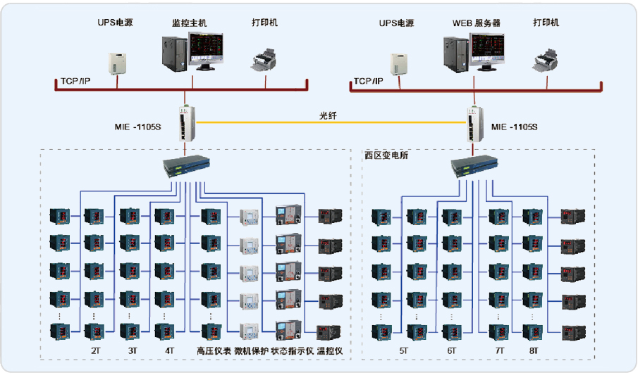 本監(jiān)控系統(tǒng)主要實(shí)現(xiàn)中科院蘇州醫(yī)工所的10/0.4kV配電系統(tǒng)進(jìn)行用電監(jiān)測與電能管理;監(jiān)測范圍為一樓變電所的T3、T4變壓器進(jìn)線柜,聯(lián)絡(luò)柜,溫控儀和二樓變電所的T1、T2變壓器進(jìn)線柜,聯(lián)絡(luò)柜,溫控儀,高壓側(cè)儀表及綜保進(jìn)行遠(yuǎn)程實(shí)時(shí)監(jiān)控和電能管理。該系統(tǒng)總計(jì)有110只儀表(其中包括100只ACR220E,6只ABB,4只溫控儀),分7條總線,其中一樓變電所3條總線,二樓變電所4條總線,兩變電所都是直接通過屏蔽雙絞線走橋架拉至值班室連接到串口服務(wù)器,再通過網(wǎng)線連接至監(jiān)控主機(jī)實(shí)現(xiàn)總線上儀表與監(jiān)控主機(jī)的數(shù)據(jù)連通。