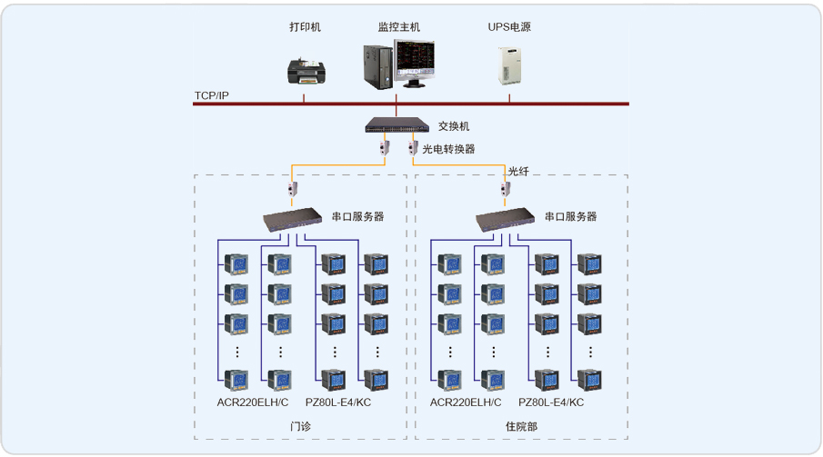 整個(gè)系統(tǒng)采用網(wǎng)絡(luò)分布式結(jié)構(gòu),監(jiān)控主機(jī)位于報(bào)告廳和外科樓的地下一層的動(dòng)力中心中。該項(xiàng)目實(shí)現(xiàn)了哈醫(yī)大一院2個(gè)樓內(nèi)遠(yuǎn)程精細(xì)化及時(shí)性報(bào)警。設(shè)計(jì)方案為2個(gè)樓內(nèi)的2個(gè)配電室,儀表數(shù)據(jù)通過(guò)485接口,MODBUS通訊協(xié)議經(jīng)數(shù)據(jù)采集器輸送到值班室主機(jī)。