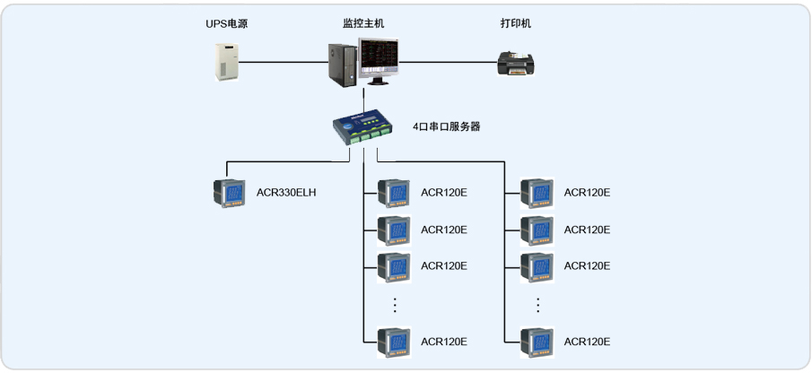 廠區(qū)配電中心為本項目提供一套高、低壓后臺監(jiān)控系統(tǒng),將對廠區(qū)內(nèi)電氣室中改造安裝的19塊智能電測儀表進行集中監(jiān)視。具體監(jiān)控數(shù)據(jù)為:用電量計量、實時測量相電壓、線電壓、有功功率、無功功率、視在功率、功率因數(shù)、頻率等數(shù)據(jù),能打印月度用電報表,并有歷史曲線的查詢(時間不小于30天),重要回路需要對其諧波進行測量。各參數(shù)及數(shù)據(jù)通過RS485總線,通過網(wǎng)絡(luò)送至配電中心的電工值班室(后臺監(jiān)控中心)。