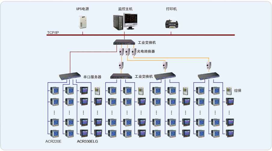 藍(lán)礬化工配電系統(tǒng)管理監(jiān)控系統(tǒng)主要實(shí)現(xiàn)對(duì)藍(lán)礬化工的主控配電室、消防配電室、造氣0.4KV配電室開關(guān)柜內(nèi)安裝的213只ACR120EL、11只ACR330ELG、80只電力儀表 、4只綜保的監(jiān)測(cè)和控制。系統(tǒng)通過(guò)安裝在工廠電網(wǎng)中主要受電點(diǎn)和樞紐配電柜中的電能監(jiān)測(cè)儀表采集到配電網(wǎng)的各項(xiàng)電力參數(shù)信號(hào),再將信號(hào)轉(zhuǎn)換為數(shù)據(jù)傳輸?shù)接?jì)算機(jī)中,計(jì)算機(jī)對(duì)數(shù)據(jù)進(jìn)行存儲(chǔ)、計(jì)算和分類存儲(chǔ)到數(shù)據(jù)庫(kù)中,然后通過(guò)計(jì)算軟件將電能以報(bào)表、圖表的形式進(jìn)行展示。電能管理人員可通過(guò)計(jì)算機(jī)看到電能的輸入、傳輸、消耗的全過(guò)程。