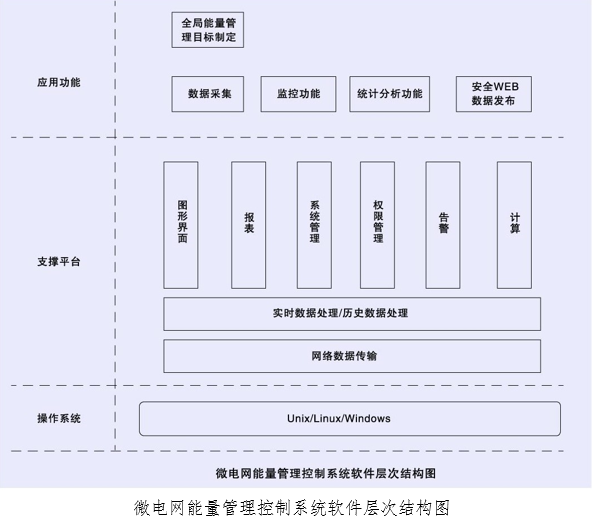 微電網能量管理控制系統軟件體系結構由操作系統、支撐平臺、應用功能共三個層次組成,應用功能又分為基本應用功能和高級管理功能兩個部分,如下圖所示。操作系統支持跨平臺,支撐平臺包含數據采集管理、數據庫管理、網絡通信管理、圖形管理、報表管理、權限管理、報警管理、計算統計等模塊。基本應用功能包括SCADA處理、監控功能、統計分析功能、安全WEB數據發布等。高級管理功能包括全局能量管理目標制定等。