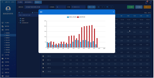 對建筑、區(qū)域、分項、支路等結(jié)構(gòu)按日、月、年報表的形式統(tǒng)計對分類能源用能進行統(tǒng)計,支持報表數(shù)據(jù)導出EXCEL,支持選擇建筑數(shù)據(jù)進行生成柱狀圖。