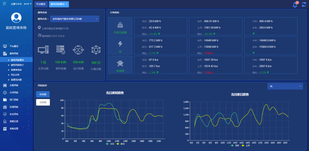 平臺運行狀態(tài),當月能耗折算、地圖導航,各能耗逐時、逐月曲線,當日,當月能耗同比分析滾動顯示。