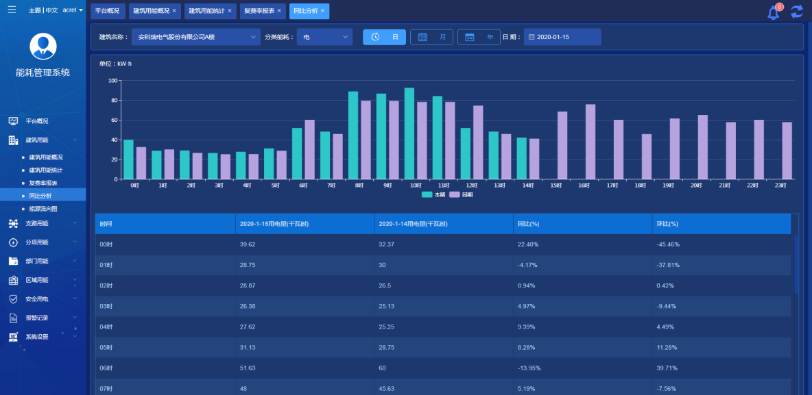 對建筑、分項、區(qū)域、支路等用能按日、月、年以圖形和報表結(jié)合的方式進行用能數(shù)據(jù)同比分析。