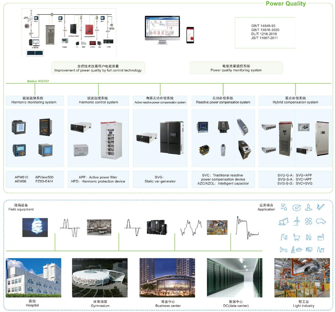 電能質量分析與治理系統主要是研究消除供配電系統中的無功補償和諧波治理問題,主要的產品有有源電力濾波器、低壓無功功率補償裝置、靜止無功發生器、混合動態濾波補償裝置、混合動態消諧補償裝置、智慧型動態無功補償裝置、諧波保護器等,適用于新建、改建、擴建和技改項目中工業與民用及公共建筑內電氣設備的無功補償、諧波抑制及綜合治理等,可根據不同行業類型和負載類型的電能質量問題提供合適的設計解決方案,以達到改善供電質量和確保電力系統安全經濟運行的目的。