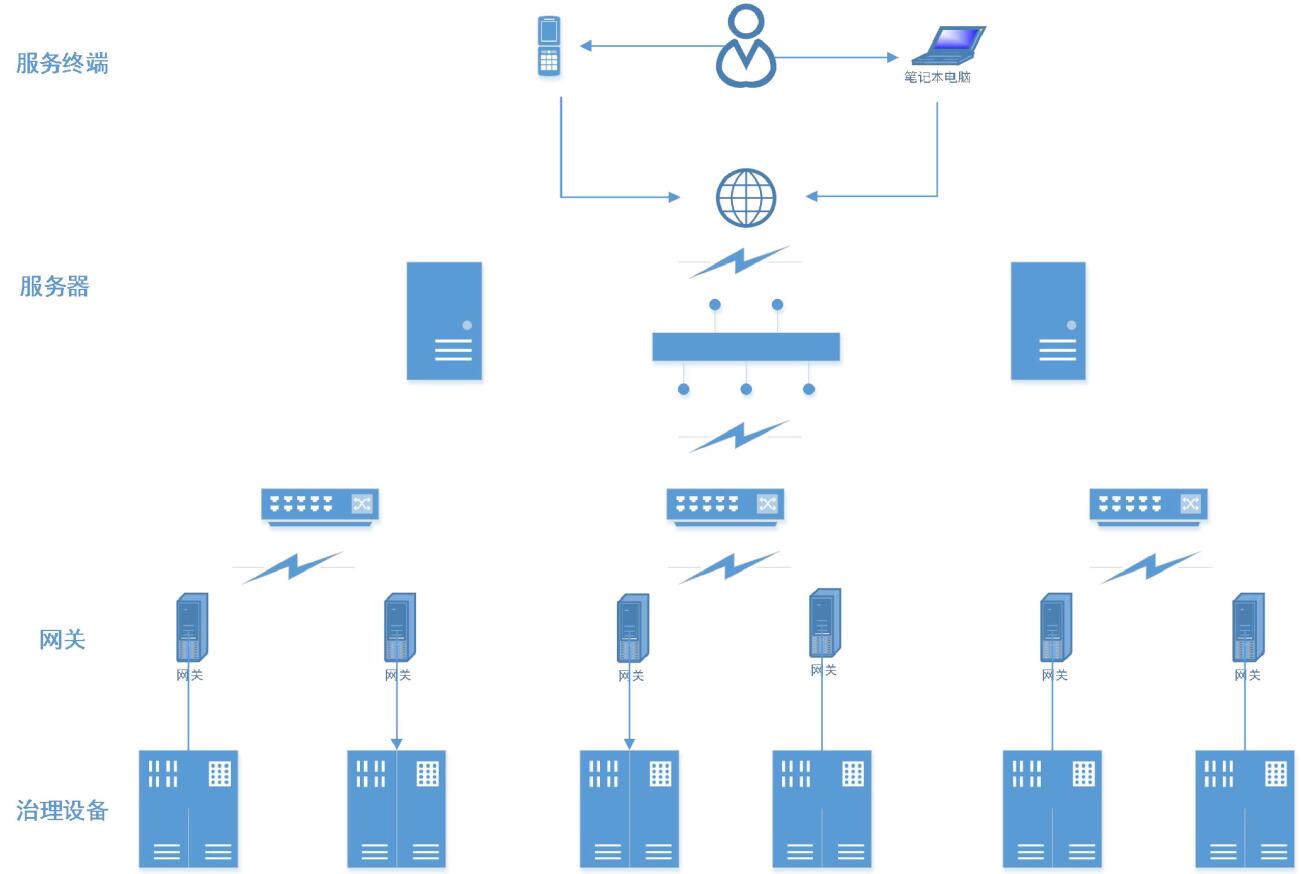 電能質量分析與治理系統平臺主要由電能質量治理設備、物理網關、服務器及服務終端四部分組成,其中電能質量治理設備作為基礎實現對數據采集與電能質量補償等具體服務動作,物理網關實現設備與服務器間的數據傳輸以及對設備進行策略功能分配,數據經由服務器最終以服務終端為媒介為用戶提供可視化展示。