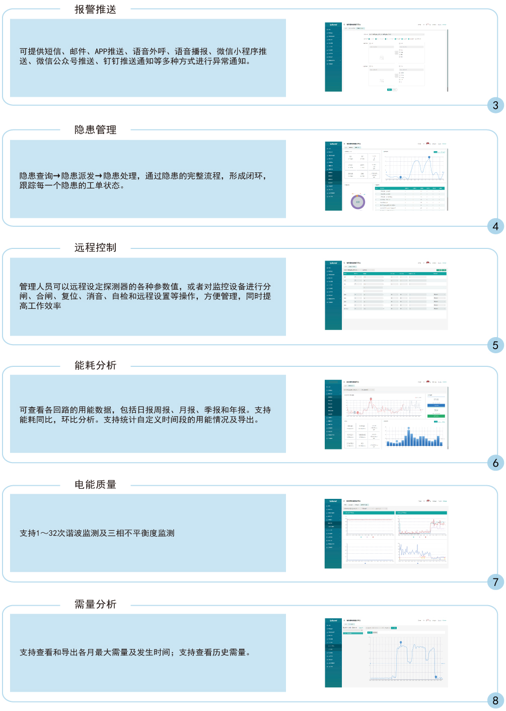2.2、平臺能夠對于監測點的電壓相序、電壓電流不平衡度、三相電流總諧波含量、三相電流2-31次諧波、三相電壓總諧波含量、三相電壓2-31次諧波、實時需量、最大需量都能夠進行有效監控,為提高用電質量提供依據。