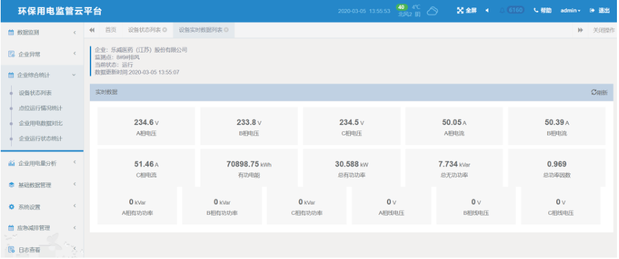 設備狀態分析:統計分企業某個時間段內的產污設備運行、停機,監測設備失聯,可以查看實時上報的數值。