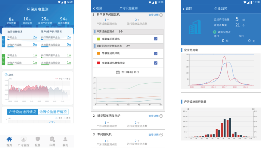 用電統計:以曲線圖的方式展示今日空氣質量與企業生產用電趨勢的對比,以及昨日和今日企業總用電情況。