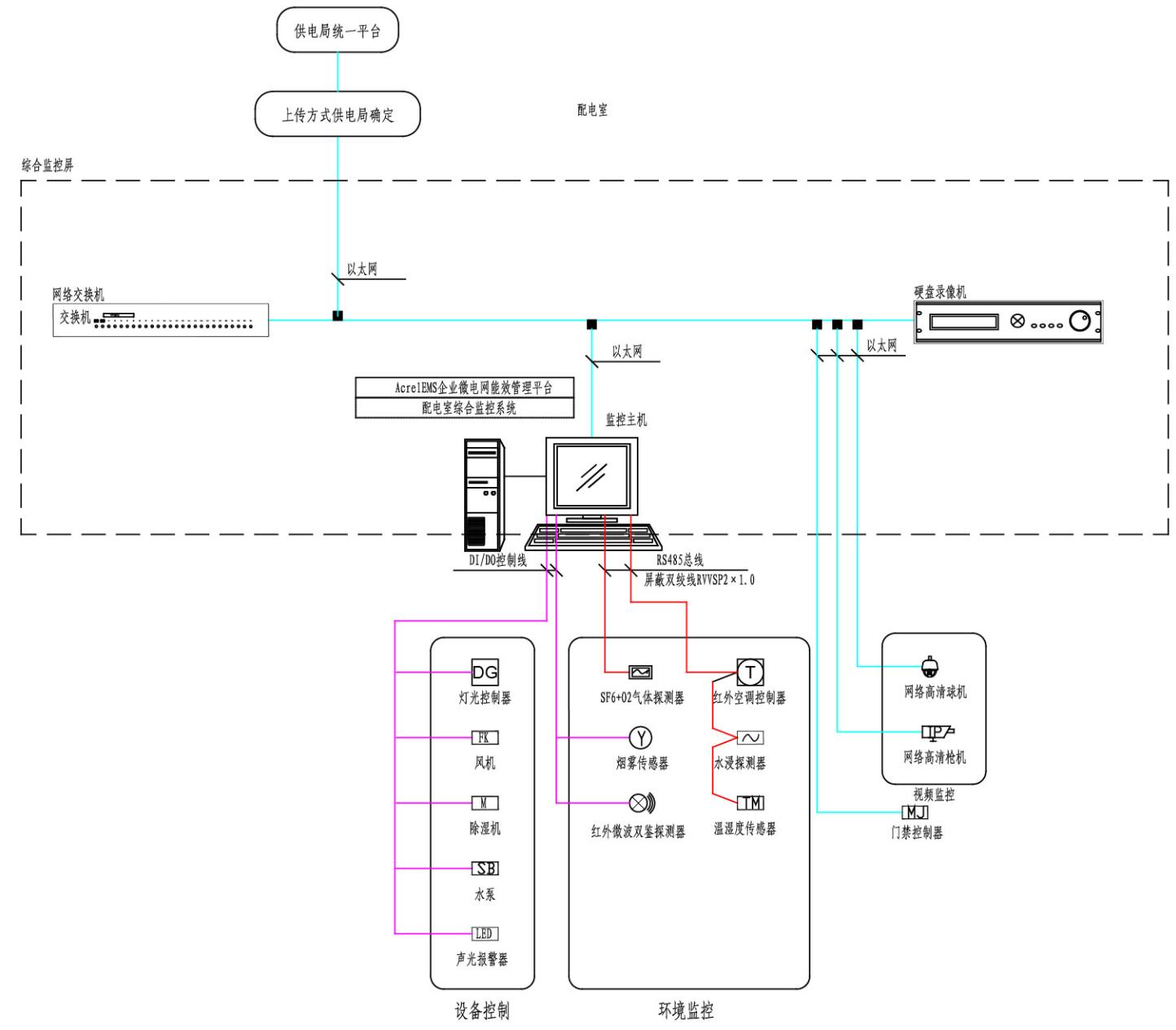 配電室綜合監(jiān)控系統(tǒng)包括智能監(jiān)控系統(tǒng)屏、通訊管理機(jī)、UPS電源、視頻監(jiān)控子系統(tǒng)(云臺(tái)球機(jī)、槍機(jī))、環(huán)境監(jiān)測(cè)子系統(tǒng)(溫度、濕度、水浸、煙感)、控制子系統(tǒng)(燈光、空調(diào)、除濕機(jī)、風(fēng)機(jī)、水泵)、門禁監(jiān)控子系統(tǒng)(讀卡器、開門按鈕、磁力鎖)、安防監(jiān)控子系統(tǒng)(雙鑒檢測(cè)器)。