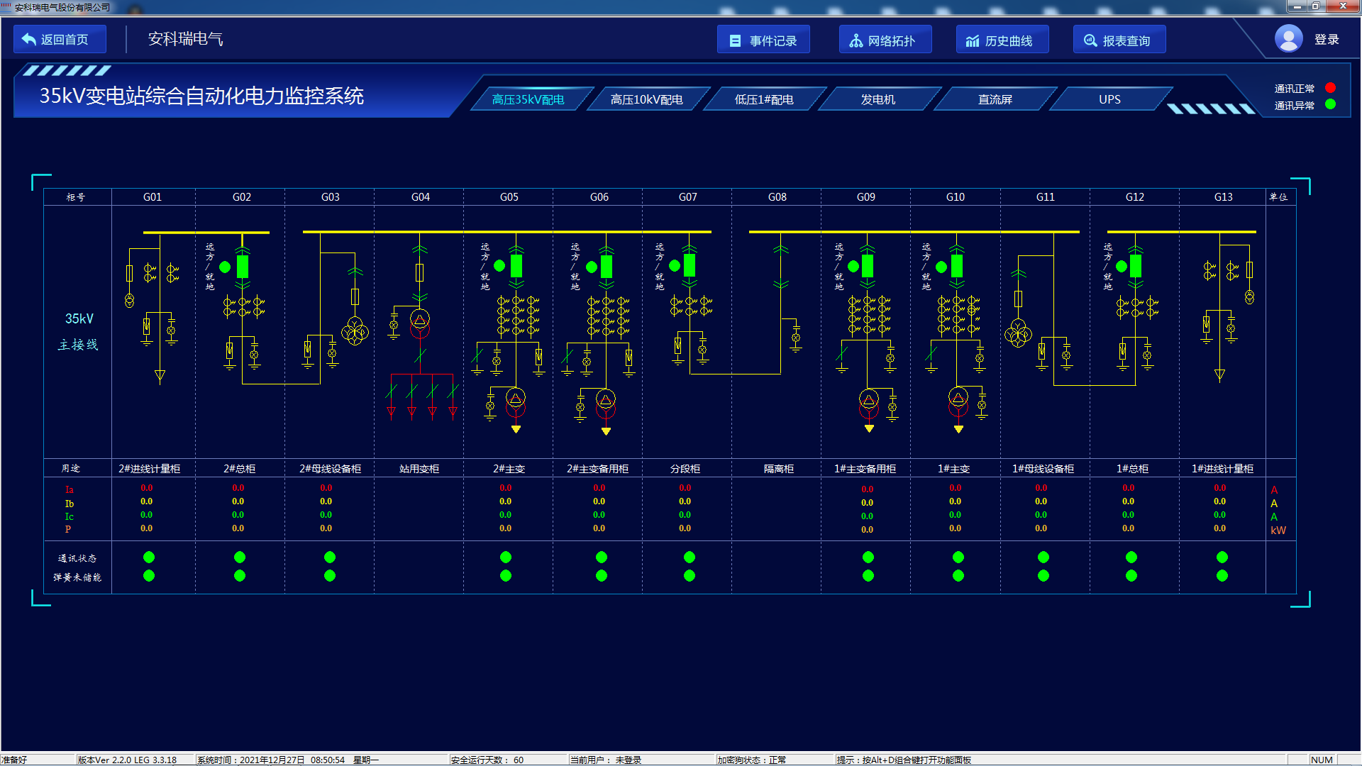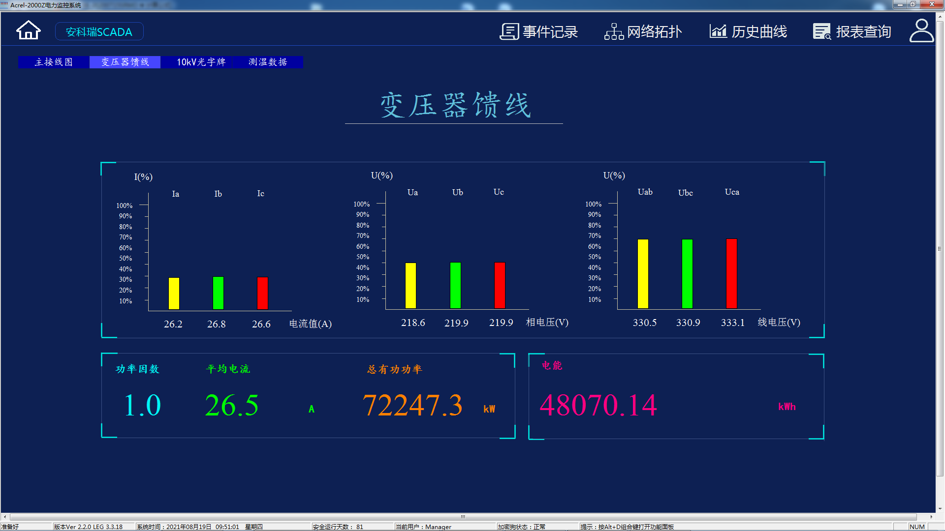 系統(tǒng)提供了完整的SCADA功能,包括主接線(xiàn)圖、設(shè)備工況、實(shí)時(shí)數(shù)據(jù)顯示、定值管理、SOE報(bào)警/記錄/查詢(xún)/打印、棒圖、實(shí)時(shí)/歷史曲線(xiàn)、語(yǔ)音報(bào)警、歷史信息查詢(xún)、用戶(hù)權(quán)限管理、各種運(yùn)行數(shù)據(jù)統(tǒng)計(jì)分析報(bào)表等。系統(tǒng)可以協(xié)助運(yùn)維人員快速故障分析、定位和排除問(wèn)題,對(duì)配電系統(tǒng)和用電設(shè)備進(jìn)行用能分析和能效管理。可以幫助企業(yè)提高供電可靠性、降低運(yùn)營(yíng)成本、提高生產(chǎn)效率,加快供配電過(guò)程中異常狀態(tài)的反應(yīng)速度。