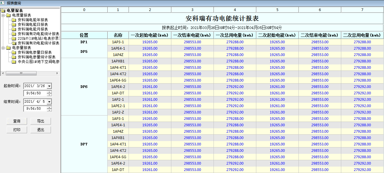 Acrel-1000綜合自動(dòng)化監(jiān)控系統(tǒng)具備定時(shí)抄表匯總統(tǒng)計(jì)功能,用戶(hù)可以自由查詢(xún)自系統(tǒng)正常運(yùn)行以來(lái)任意時(shí)間段內(nèi)各配電節(jié)點(diǎn)的用電情況,即該節(jié)點(diǎn)進(jìn)線(xiàn)用電量與各分支回路消耗電量的統(tǒng)計(jì)分析報(bào)表。