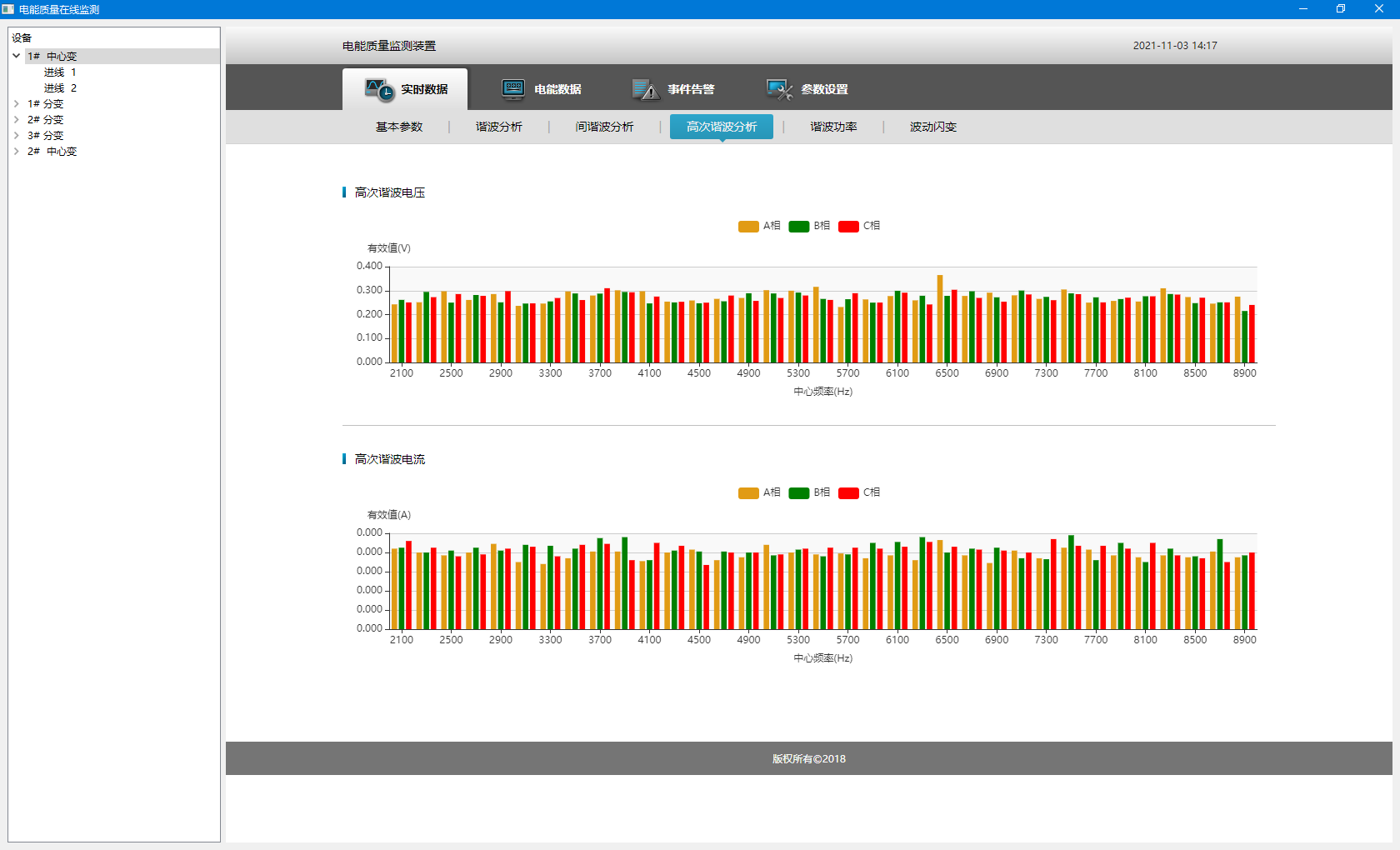 實(shí)時(shí)監(jiān)測(cè)總進(jìn)線(xiàn)和重要出線(xiàn)回路的供電電源電能質(zhì)量,包括穩(wěn)態(tài)數(shù)據(jù)監(jiān)測(cè)、暫態(tài)數(shù)據(jù)監(jiān)測(cè)和故障錄波分析。對(duì)供電系統(tǒng)中的電壓偏差、頻率偏差、三相電壓不平衡、三相電流不平衡、2~63次諧波電壓、2~63次諧波電流、0.5~63.5次間諧波電壓、0.5~63.5次間諧波電流、諧波功率、諧波畸變率等實(shí)時(shí)監(jiān)測(cè),并以柱狀圖進(jìn)行諧波分析。