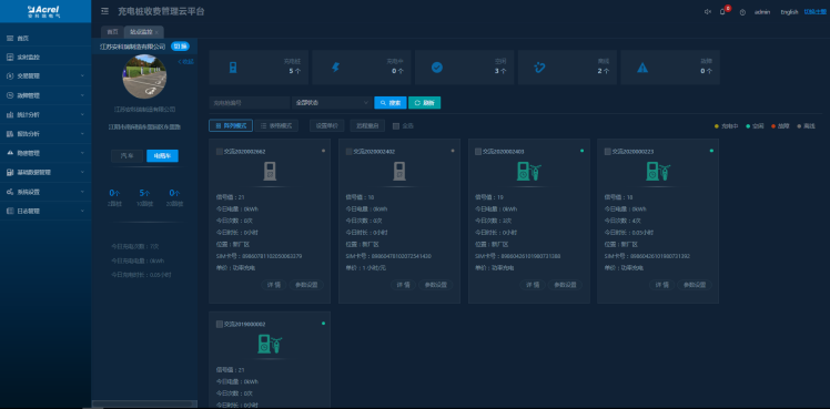 | 電瓶車智能充電樁 | AcrelCloud-9500 | (一)資源管理 充電站檔案管理,充電樁檔案管理,用戶檔案管理,充電樁異常 交易監測 (二)交易結算 充電價格策略管理,預收費管理,賬單管理,營收和財務相關報表 (三)用戶管理 用戶注冊,用戶登錄,用戶帳戶管理 (四)充電服務 充電設施搜索,充電設施查看,地圖尋址,在線自助支付充電, 充電結算,導航等 (五)微信小程序 掃碼充電,賬單查詢、充電信息監測等功能 (六)數據服務 數據采集,數據存儲和解析 (七)收益隔天結轉到帳  |