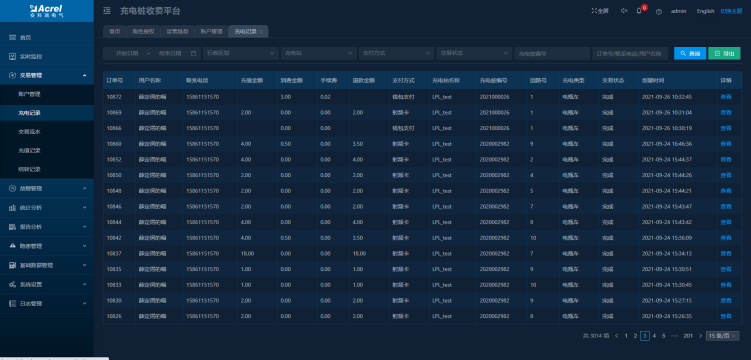 | 遠程充電樁電能管理系統 | Acrel-9000 | (一)資源管理 充電站檔案管理,充電樁檔案管理,用戶檔案管理,充電樁異常交易監測 (二)交易結算 充電價格策略管理,預收費管理,賬單管理,營收和財務相關報表 (三)用戶管理 用戶注冊,用戶登錄,用戶帳戶管理 (四)充電服務 充電設施搜索,充電設施查看,地圖尋址,在線自助支付充電,充電結算,導航等 (五)微信小程序 掃碼充電,賬單查詢、充電信息監測等功能 (六)數據服務 數據采集,數據存儲和解析 (七)收益隔天結轉到帳  |