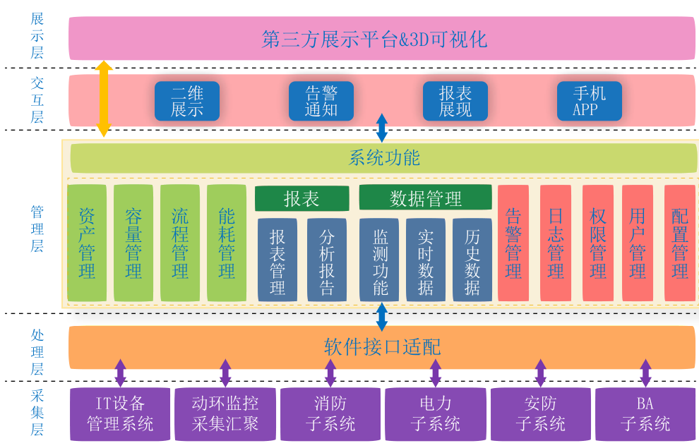 整個系統管理架構分為采集層、處理層、管理層、交互展示層四個層次。