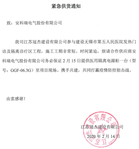 疫情沒有因為時間的推移而結束,大家依然為了早日戰勝疫情而努力。在2月14日安科瑞接到一臺醫用隔離電源柜的緊急訂單,用于無錫市第五人民醫院發熱門診及隔離診療區工作建設。