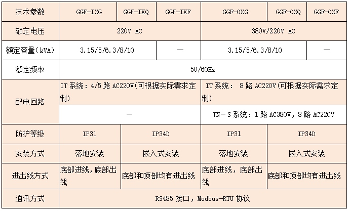 注:1.GGF-IXF和GGF-OXF型為分體式安裝的配電柜,其隔離變壓器外置。