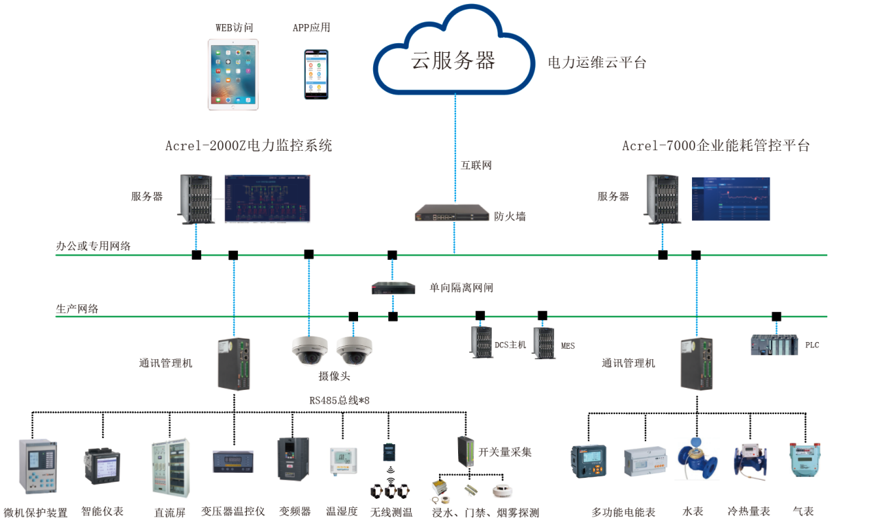 系統(tǒng)采用分布式結(jié)構(gòu),微機(jī)保護(hù)裝置、多功能儀表、變壓器溫控器、直流屏、柴油發(fā)電機(jī)控制屏等設(shè)備通過RS485總線或者以太網(wǎng)接入智能網(wǎng)關(guān),經(jīng)過協(xié)議轉(zhuǎn)換、數(shù)據(jù)處理后上傳至電力監(jiān)控系統(tǒng),實(shí)現(xiàn)遙測、遙信、遙控、異常報(bào)警等功能。