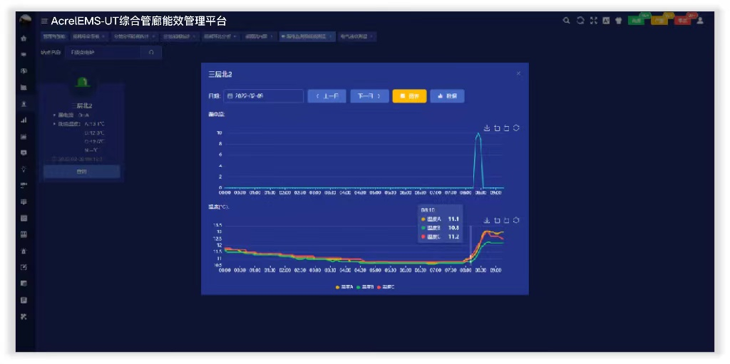 針對現場設置的傳感器監測配電系統回路的漏電電流和線纜溫度,異常時實時發出報警信號。