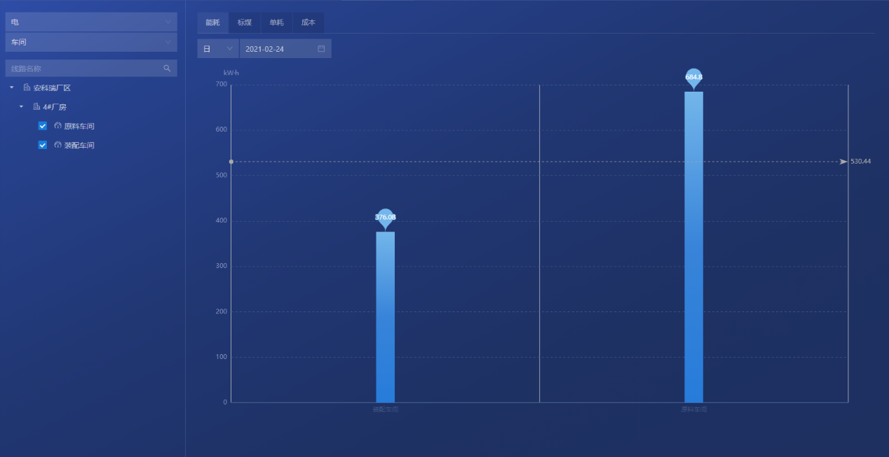 從能源使用種類、監測區域、車間、生產工藝、工序、工段時間、設備、班組、分項等維度,采用曲線、餅圖、直方圖、累積圖、數字表等方式對企業用能統計、同比、環比分析、實績分析,折標對比、單位產品能耗、單位產值能耗統計,找出能源使用過程中的漏洞和不合理地方,從而調整能源分配策略,減少能源使用過程中的浪費。