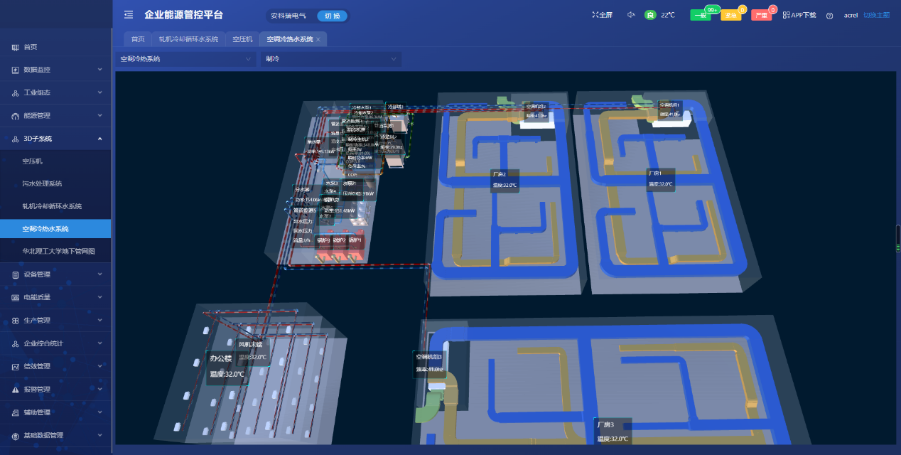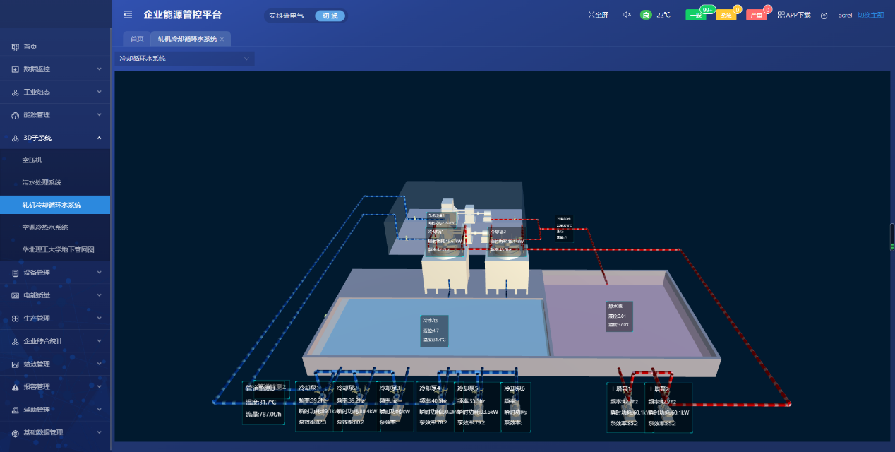 采集廠內制冷系統、循環冷卻水系統、空壓機系統、污水處理系統等運行數據,可對運行能效數據、歷史數據、實時數據、累計電量、功率、分時段(年、月、周、日)電量及功率進行展示對比分析。