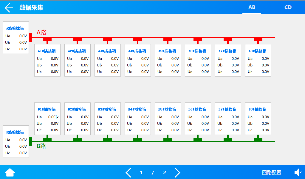 在主頁點擊數據采集按鈕后,進入系統圖界面:此界面顯示了每個箱子的電壓。