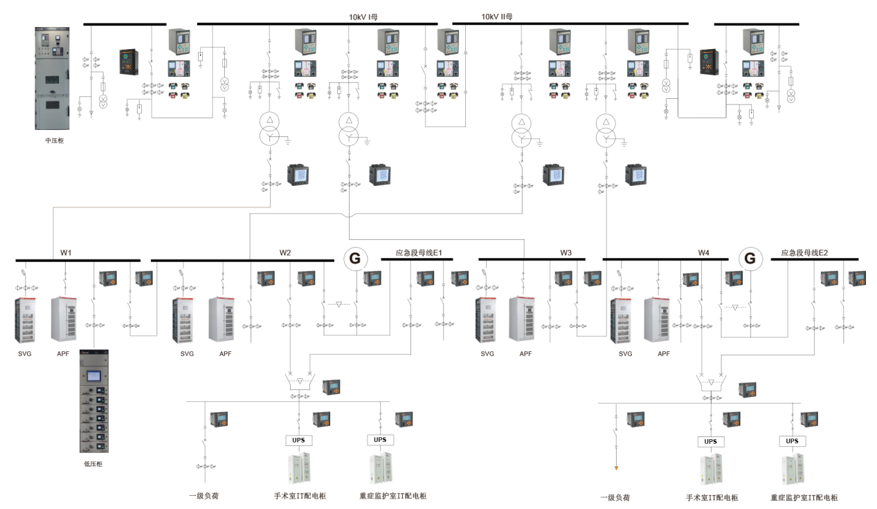 電力監(jiān)控系統(tǒng)主要針對開閉所和10/0.4kV變電所,對高壓回路配置微機(jī)保護(hù)裝置及多功能儀表進(jìn)行保護(hù)和監(jiān)控,對0.4kV出線配置多功能計(jì)量儀表,用于測控出線回路電氣參數(shù)和用能情況。同時(shí)對醫(yī)院重要設(shè)備如柴油發(fā)電機(jī)、無功補(bǔ)償裝置、有源濾波裝置、UPS、隔離電源系統(tǒng)狀態(tài)進(jìn)行監(jiān)測。