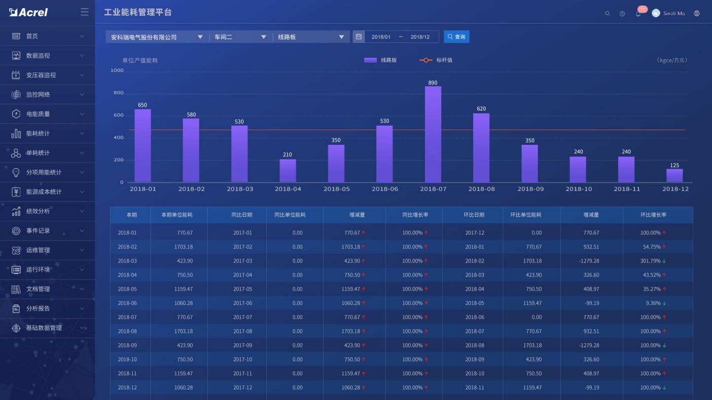 與工廠MES系統(tǒng)對接,通過產(chǎn)品產(chǎn)量以及系統(tǒng)采集的能耗數(shù)據(jù),在產(chǎn)品單耗中生成產(chǎn)品單耗趨勢圖,并進(jìn)行同比和環(huán)比分析。同時(shí)將產(chǎn)品單耗與行業(yè)/國家/國際先進(jìn)指標(biāo)對標(biāo),以便工廠能夠根據(jù)產(chǎn)品單耗情況來調(diào)整生產(chǎn)工藝,從而降低能耗。