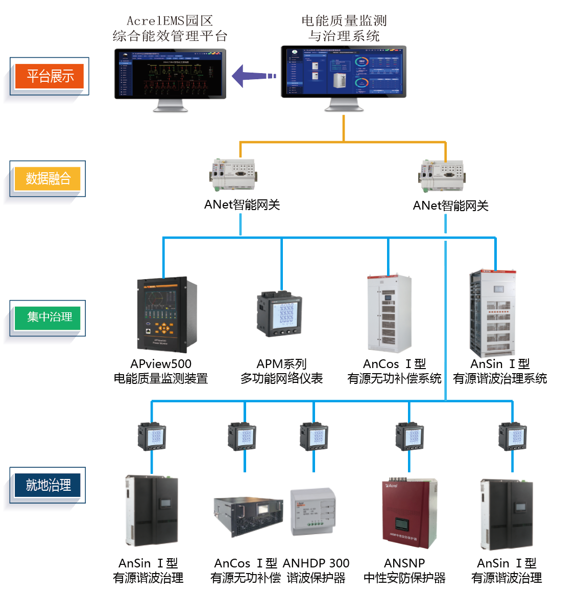 為了消除配電系統(tǒng)諧波對(duì)配電系統(tǒng)設(shè)備的影響,方案配置安科瑞AnSin有源濾波器和AnCos有源無功補(bǔ)償裝置,濾除電網(wǎng)2~31次諧波干擾,提高系統(tǒng)功率因數(shù)。